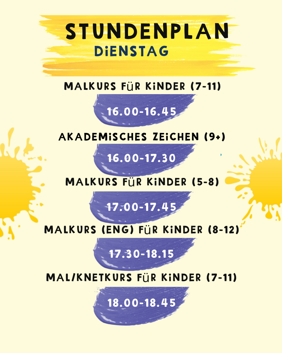 ScheduleVon admin / 09.04.2026 Montag: Malkurs für kinder in Bremen Montag: Animekurs für kinder in Bremen Dienstag: Malkurs für kinder, Akademisches zeihen Dienstag: Malkurs für kinder Mittwoch: Malkurs für kinder, Bastelnkurs Mittwoch: Mal- und knekurs für kinder ab 5 Dinnerstag: Aquarel und acryl malen in Bremen, Mal- und knekurs für kinder Freitag: Malkurs für kinder mit Eltern in Bremen Freitag: Malkurs für kinder Samstag: Akademisches zeihen, acryl zeichnen für erwachsene, Samstag: Malkurs, Knetkurs für kinder in Bremen Sonntag: Akademisches zeihen, Modededign, Schachkurs Sonntag: Schachkurs für kinder